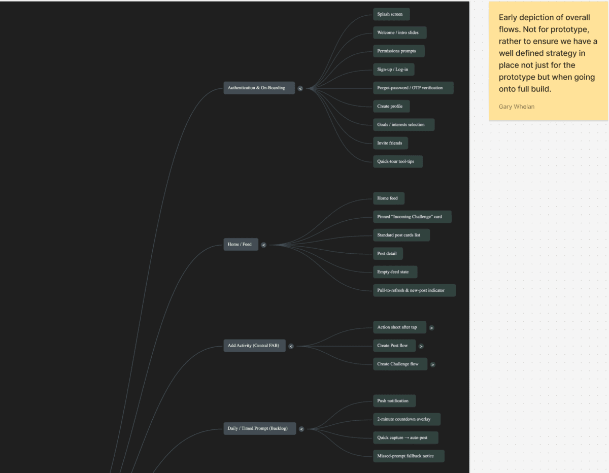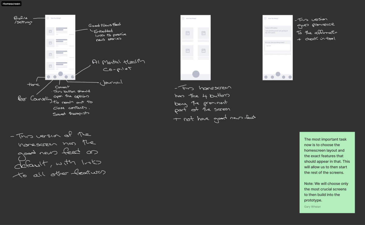 Week 2 gave both projects a solid research foundation — viability studies, behavioural research, even the research podcasts I shared with clients. Now, in Week 3, we started turning that evidence into something tangible. Early wireframes, flows, and workshops began to make the projects feel real. This was the week of moving from words to visuals.