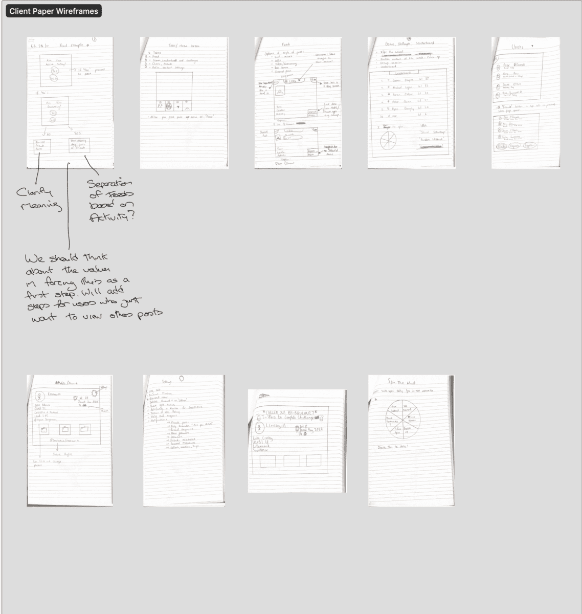 Wednesday belonged to GetActive. We ran a collaborative session where the client produced their own paper wireframes. These are always raw, but they surface assumptions: