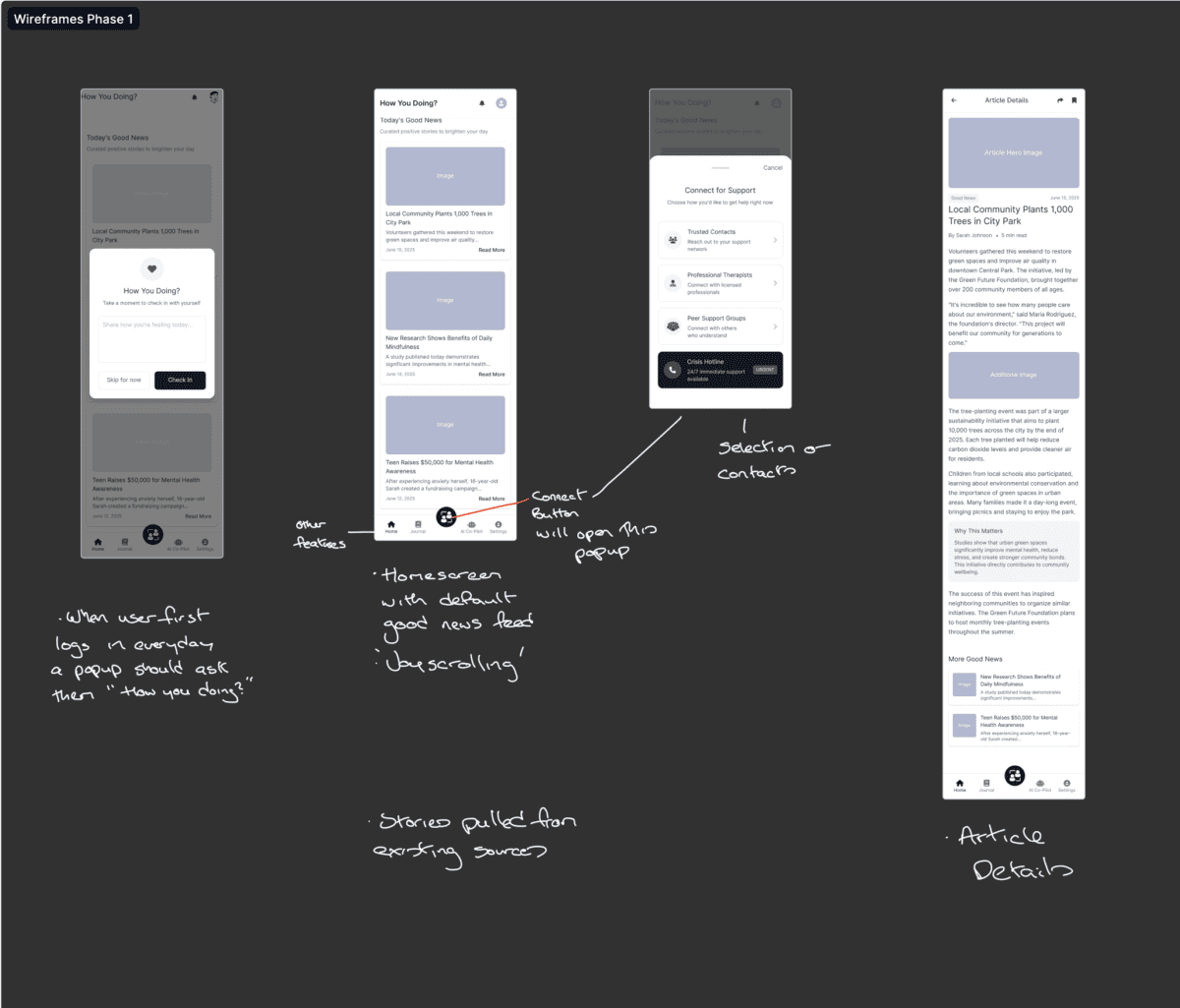 After last week’s viability and doomscrolling research, I sat down to sketch the first HYD wireframes. These weren’t polished screens — more like rough outlines to test assumptions: