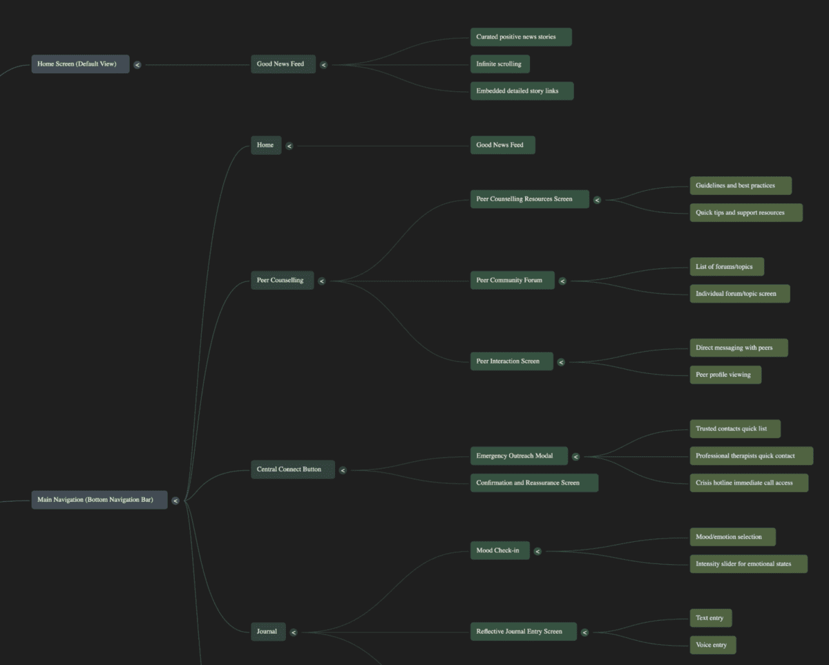 - Onboarding > Daily wellbeing prompts > Emergency escalation.